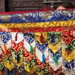 This is a Lotus Design Tashi Tha-Ring Shambu Banner, with an elaborate applique designed brocade. It’s hung around the perimeter of a shrine room along the ceiling. This style is often displayed outside monasteries during ceremonies, suspended between poles above the building. This special Shambu banner represents blessings descending on the shrine room. This style is also used on special occasions to represent the auspicious blessings of the jewels of the dharma being sent forth as multi-colored rainbow light.